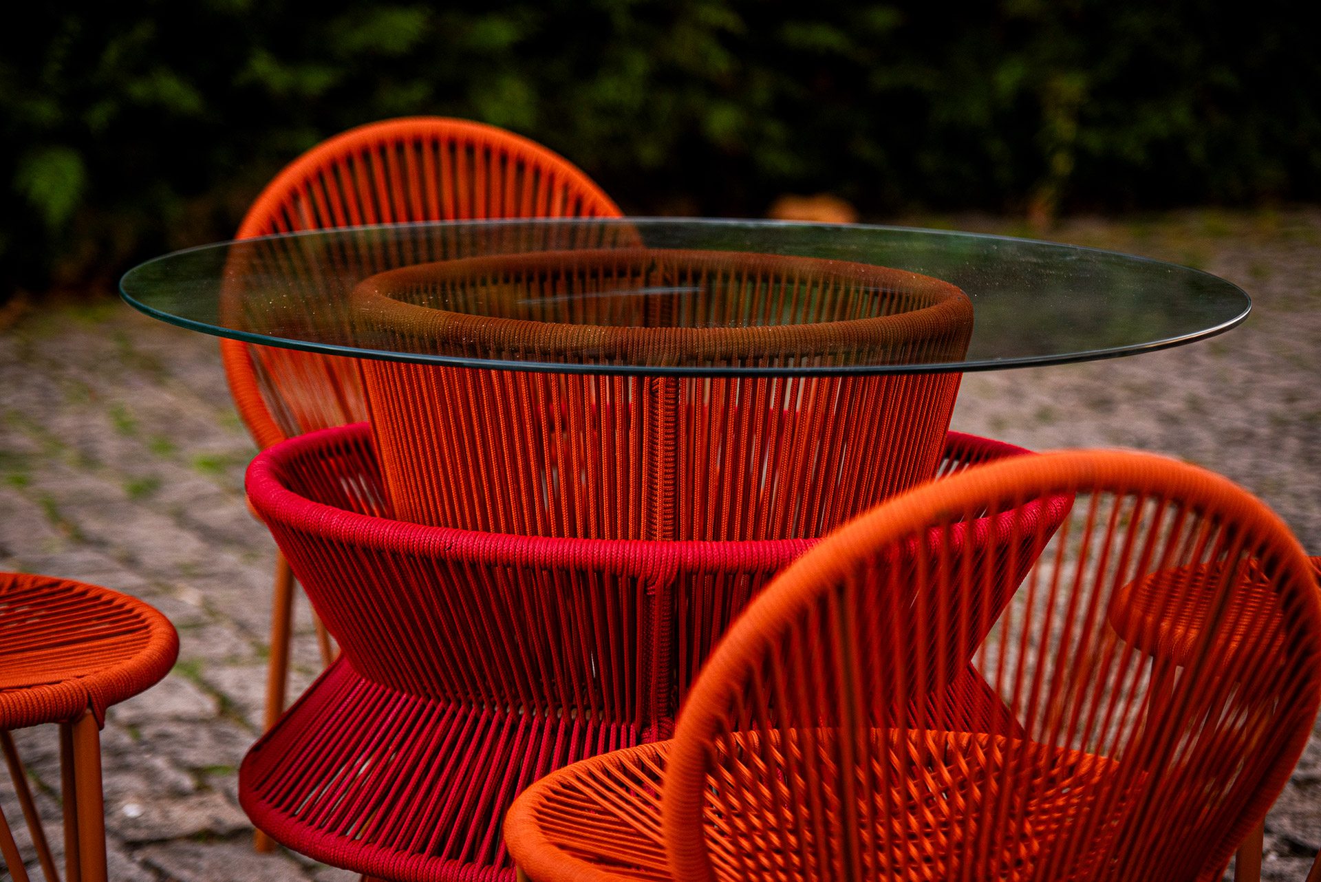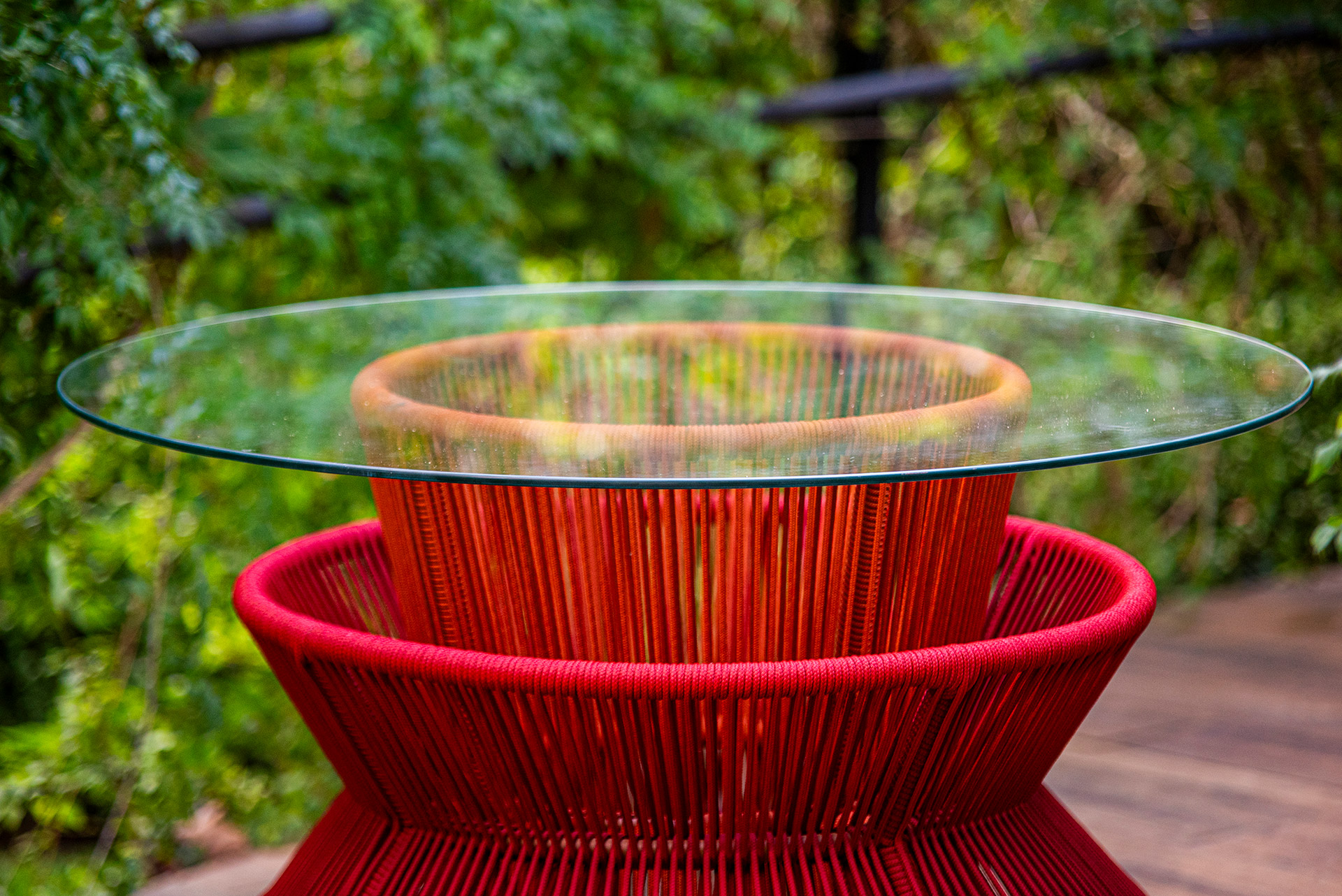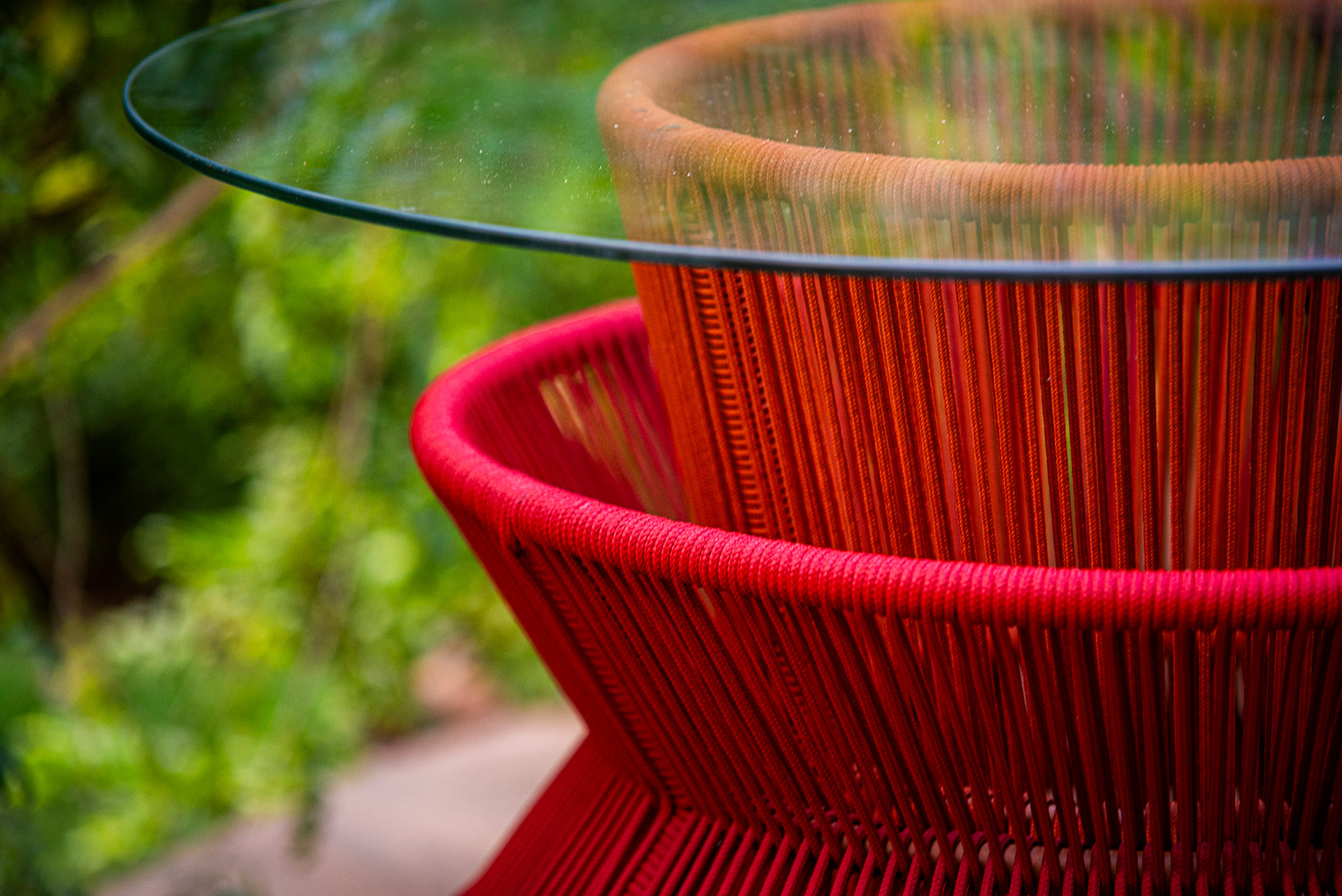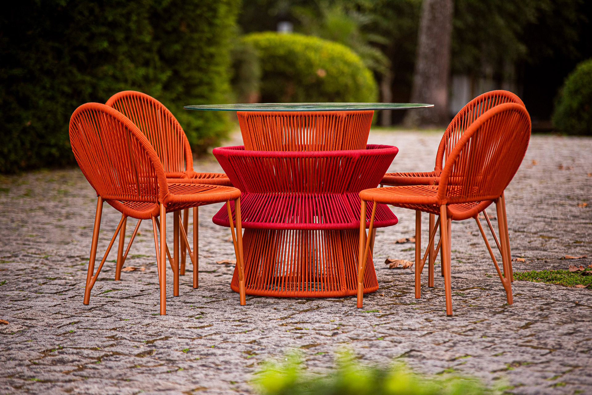 Estrutura em alumínio, pintura eletrostática e revestimento em corda náutica cilíndrica 6mm.