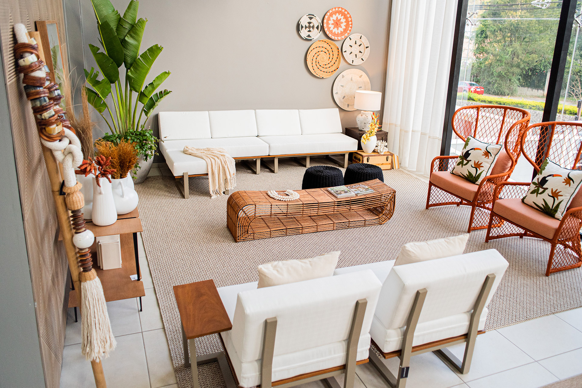 Estrutura em alumínio, pintura eletrostática e detalhes em madeira