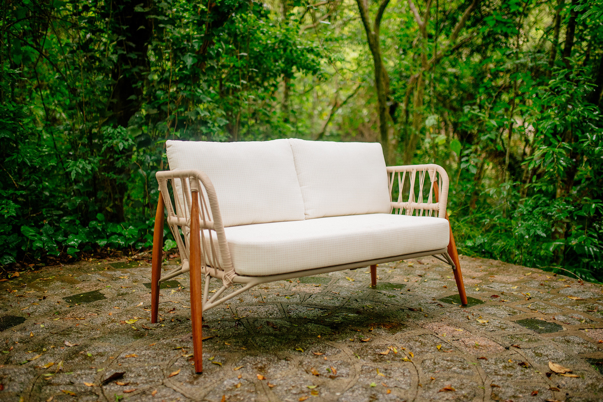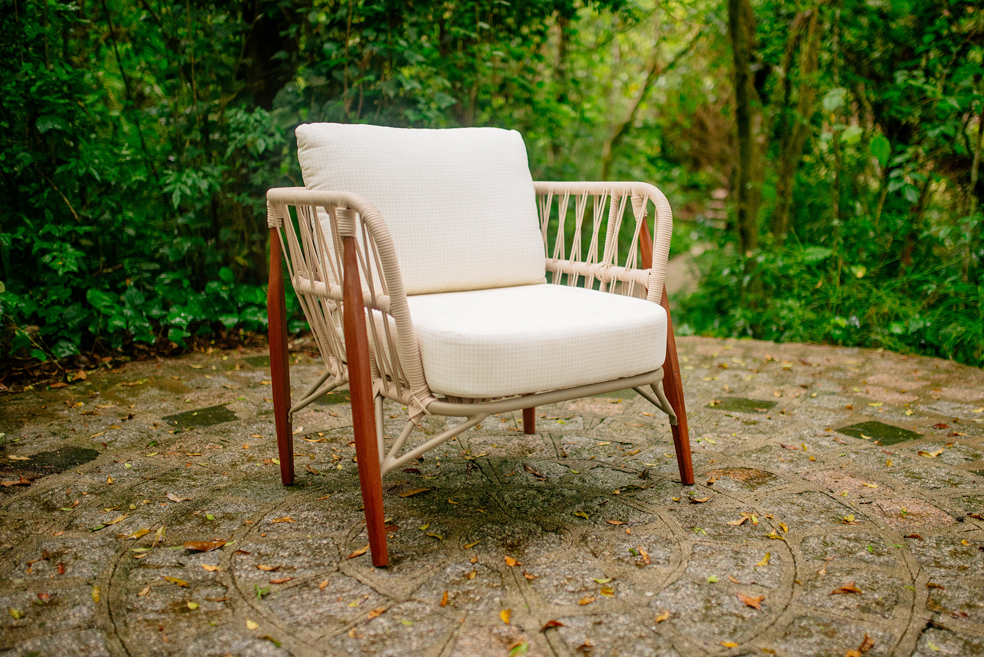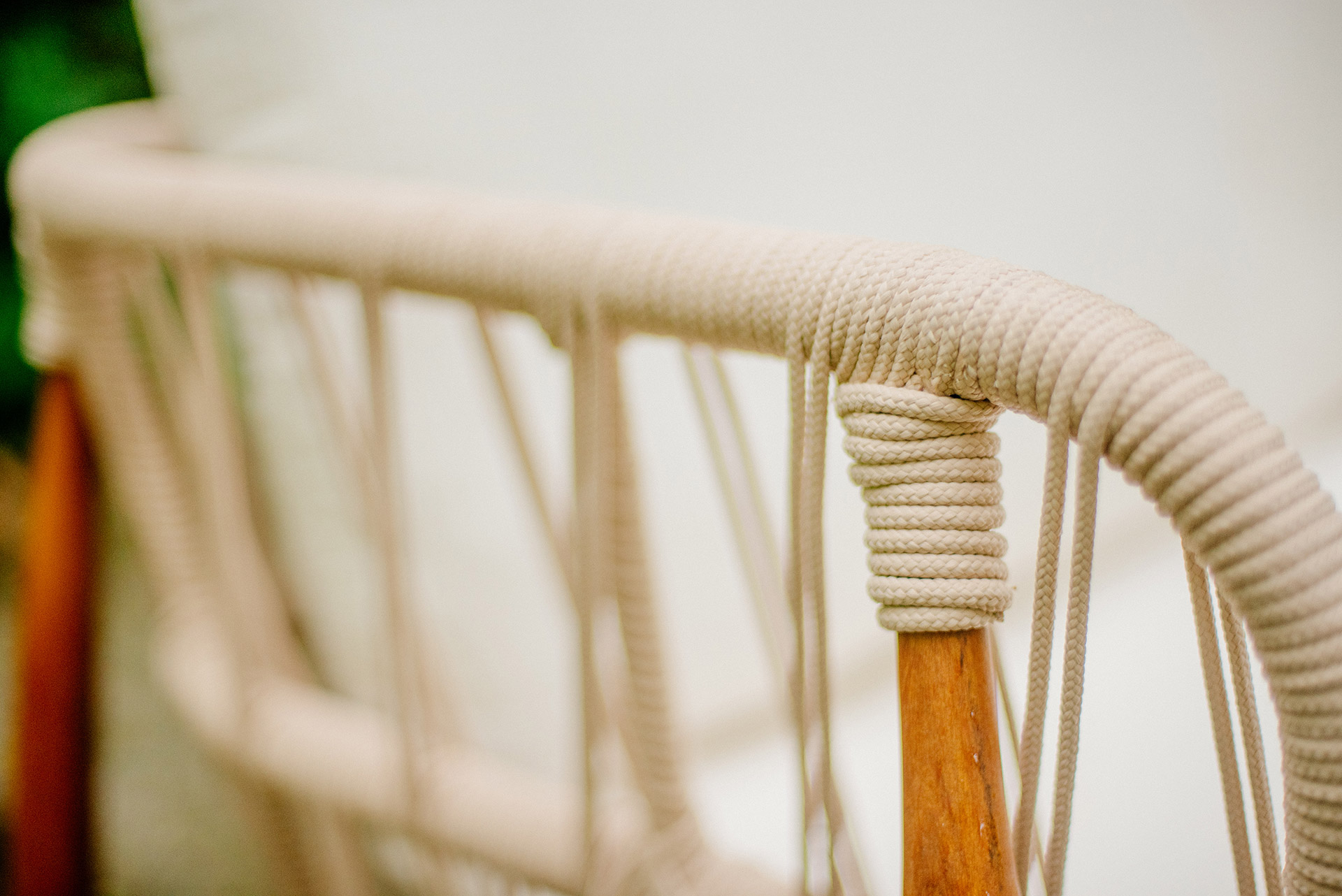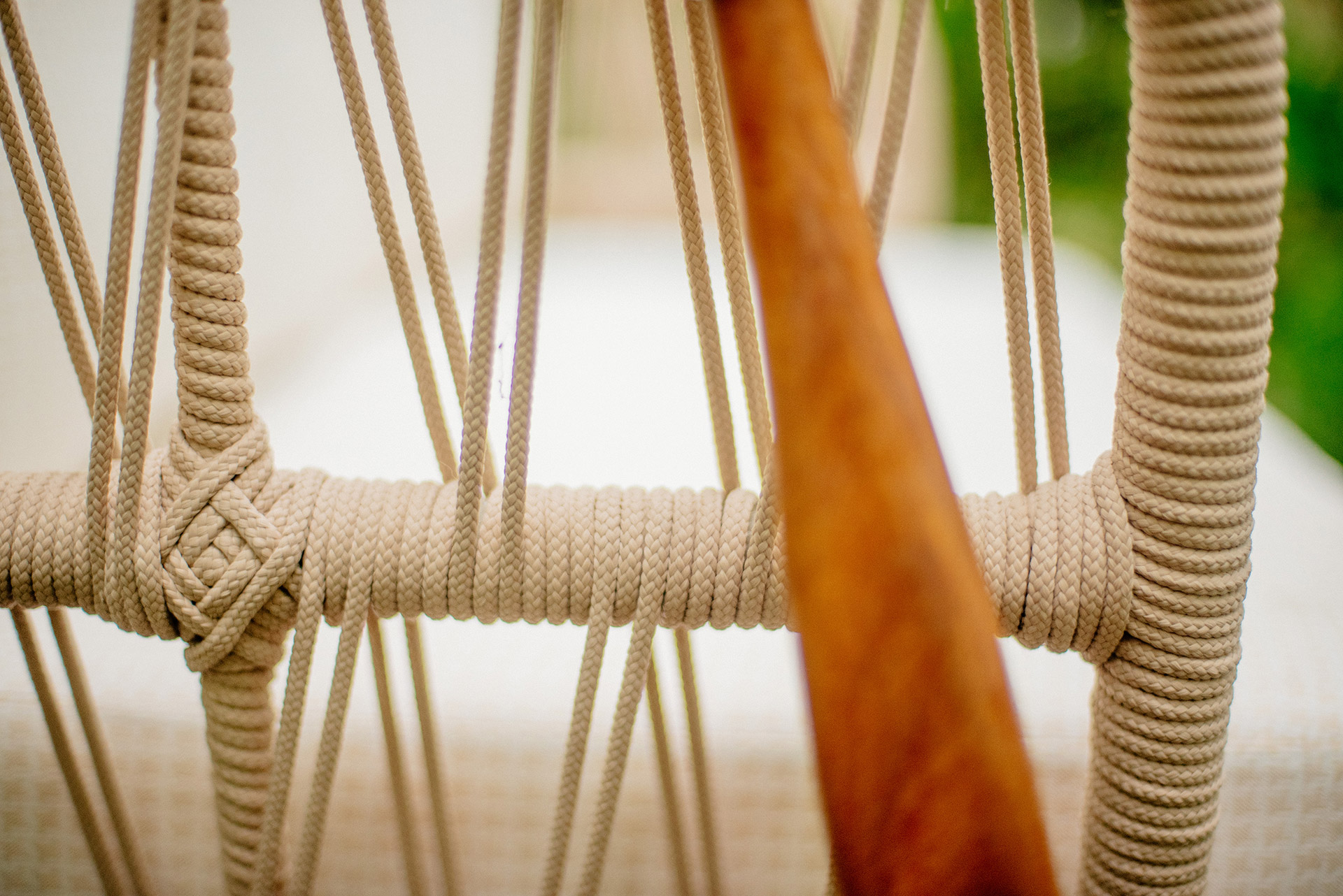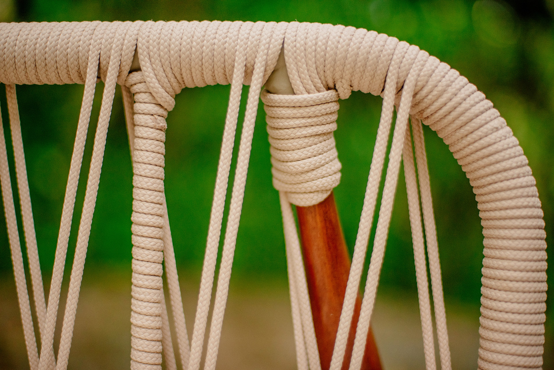 Estrutura em alumínio, pintura eletrostática, revestimento em corda náutica cilíndrica 6mm e pés em madeira.