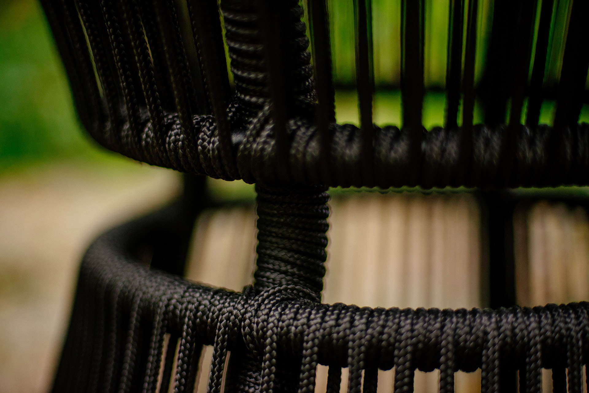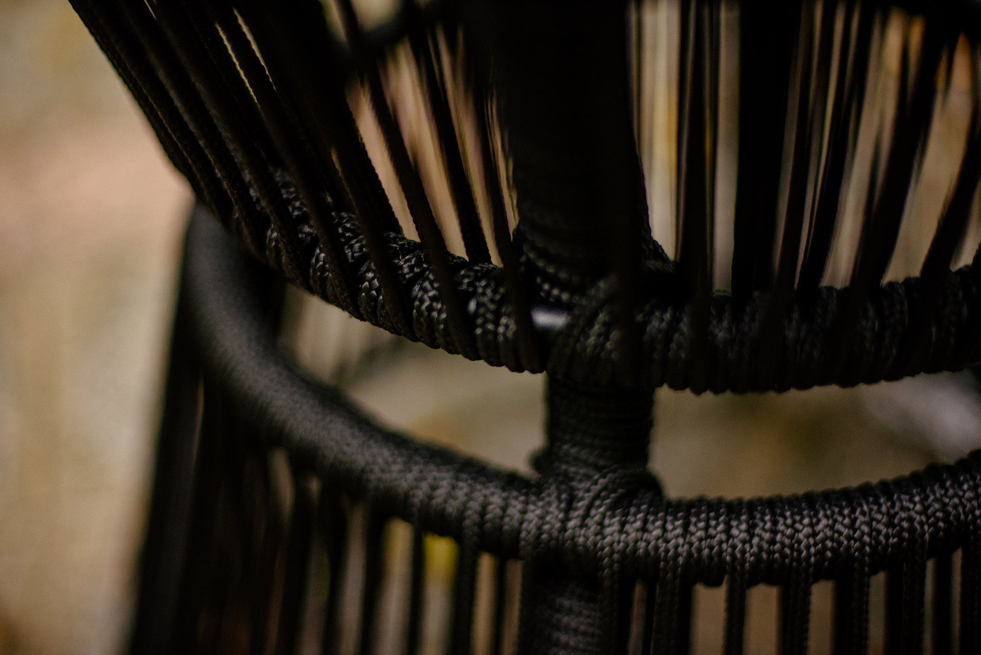 Estrutura em alumínio, pintura eletrostática e revestimento em corda náutica cilíndrica 6mm.