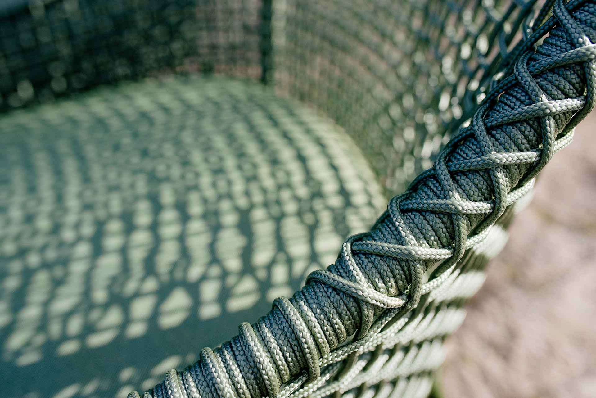 Estrutura em alumínio, pintura eletrostática e revestimento em corda náutica cilíndrica 6mm.