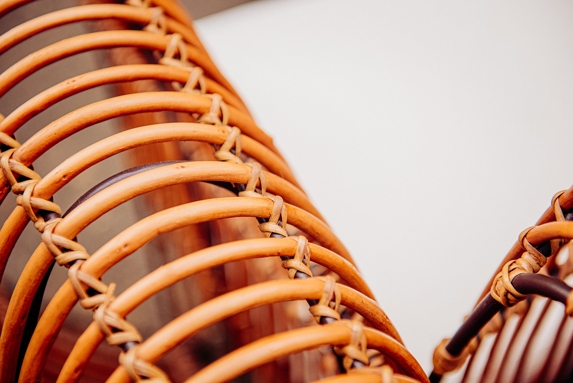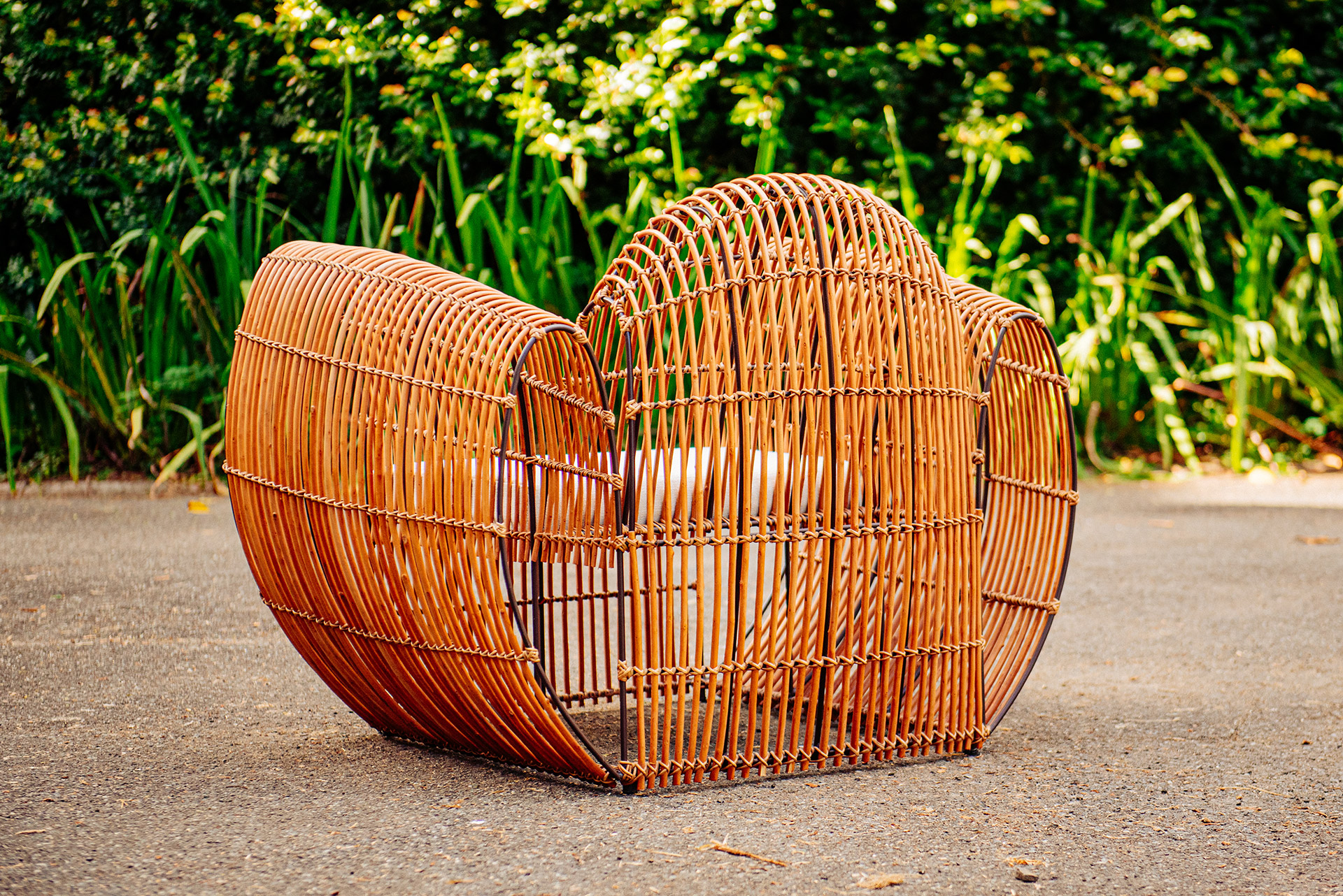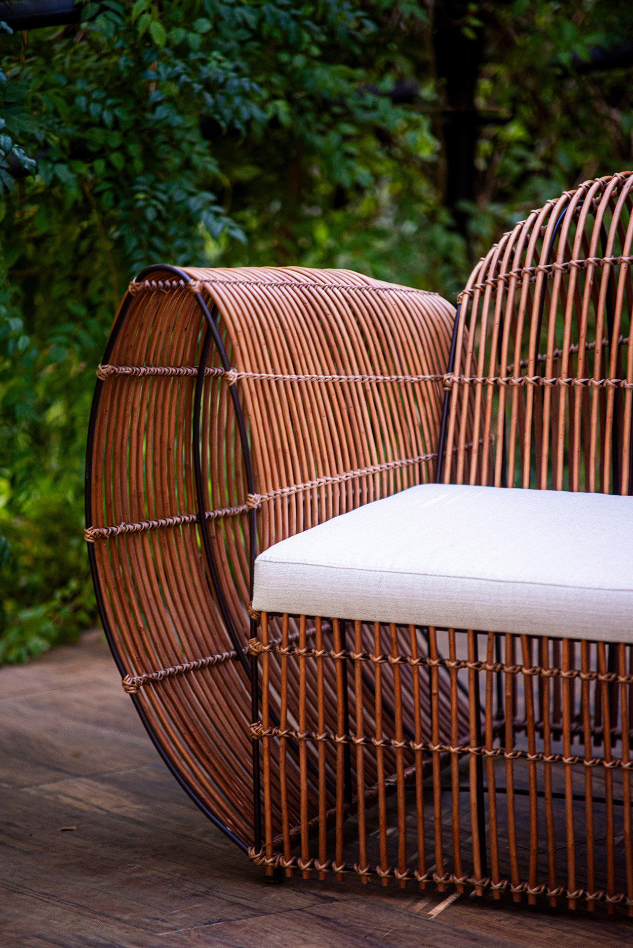 Estrutura em ferro galvanizado e revestimento em vime e amarras em junco.