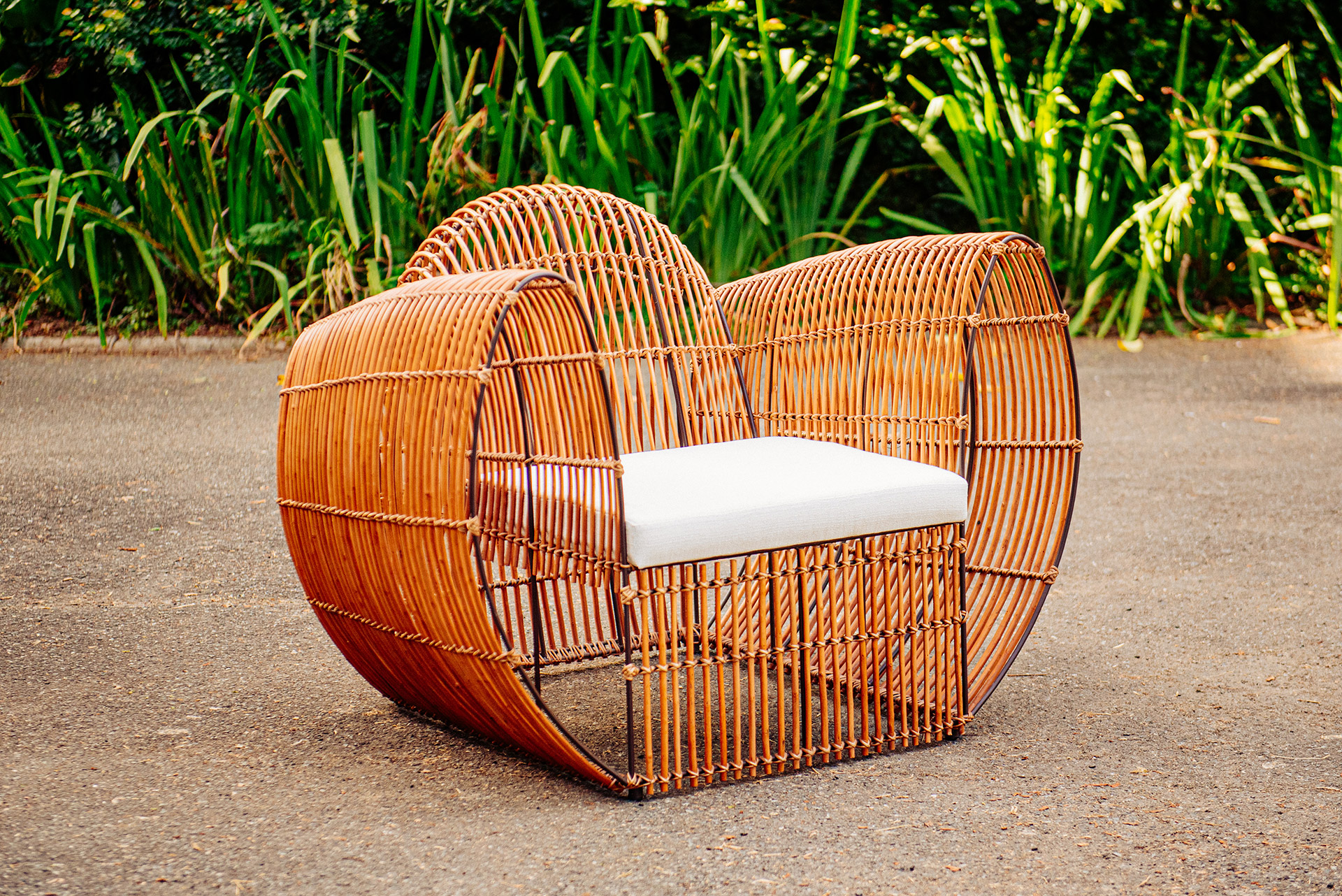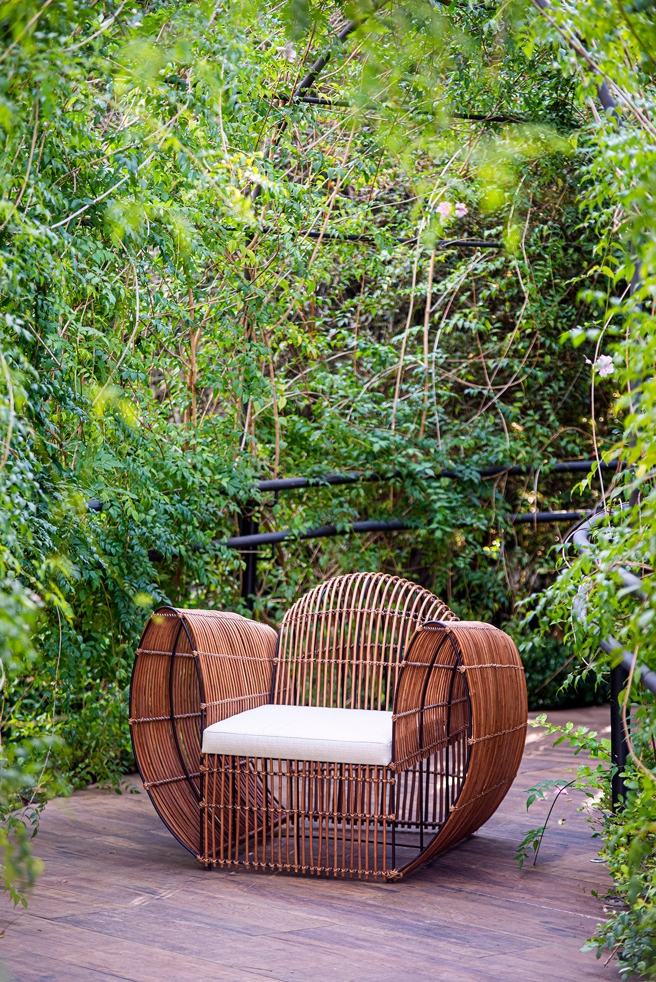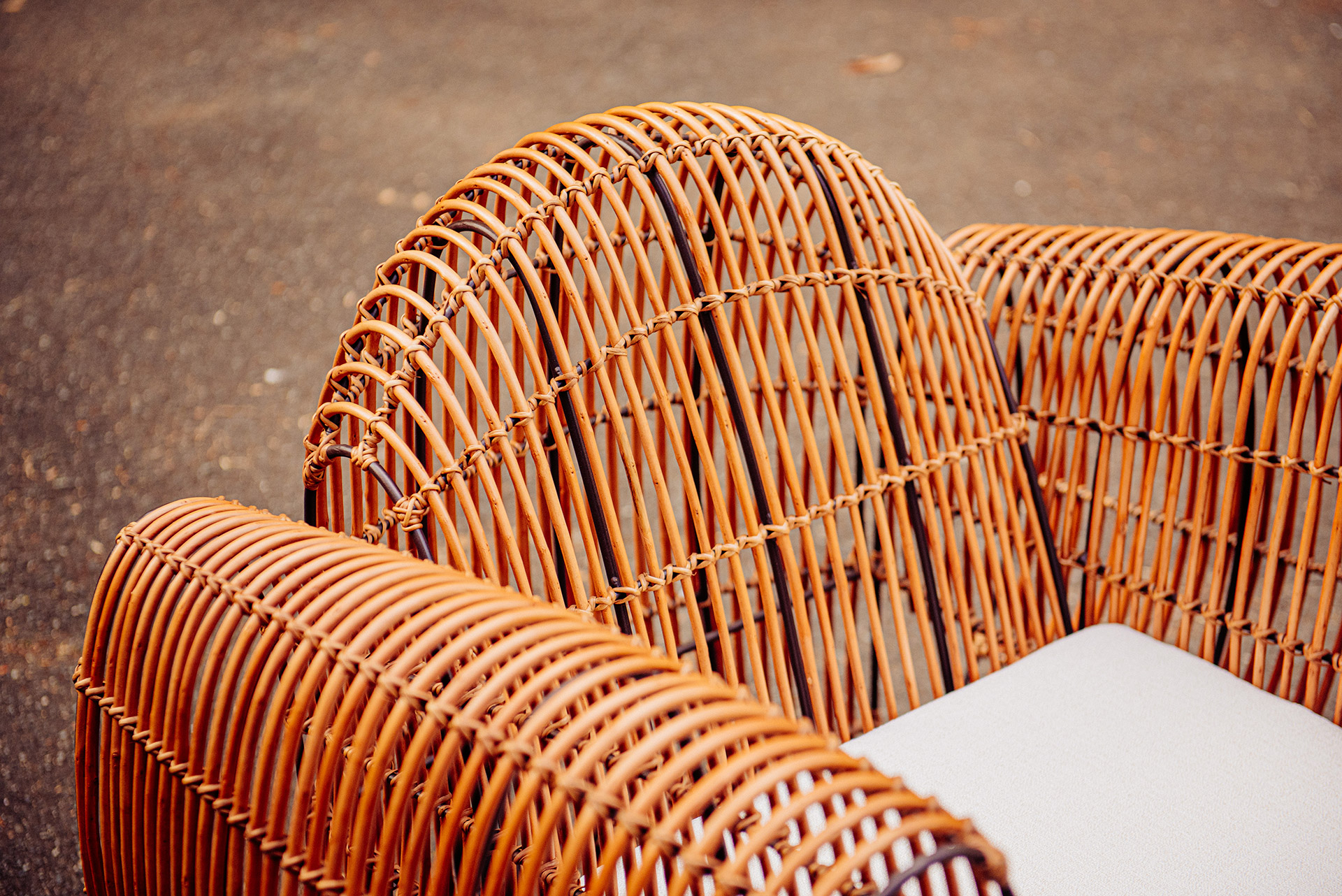 Estrutura em ferro galvanizado e revestimento em vime e amarras em junco.