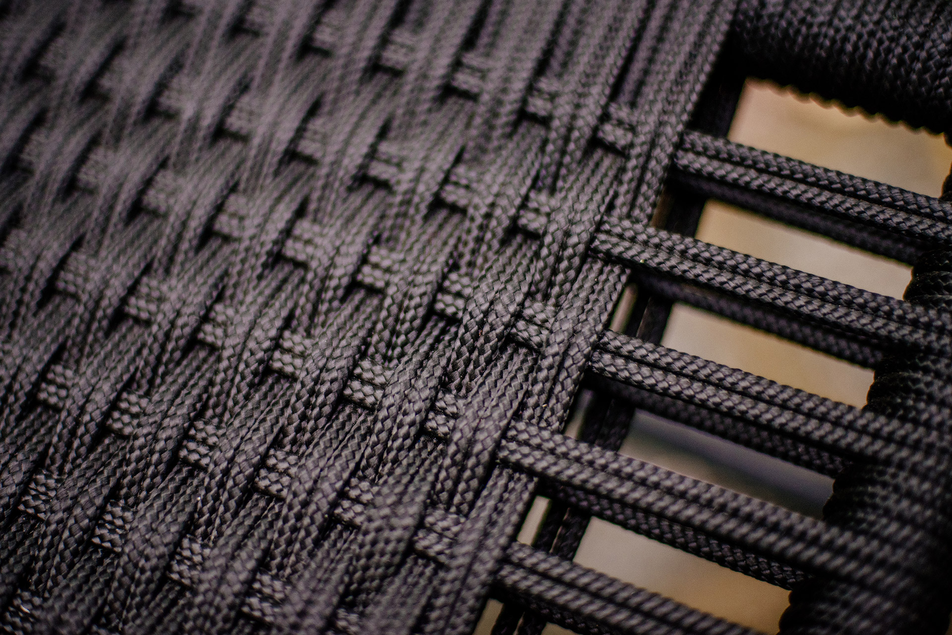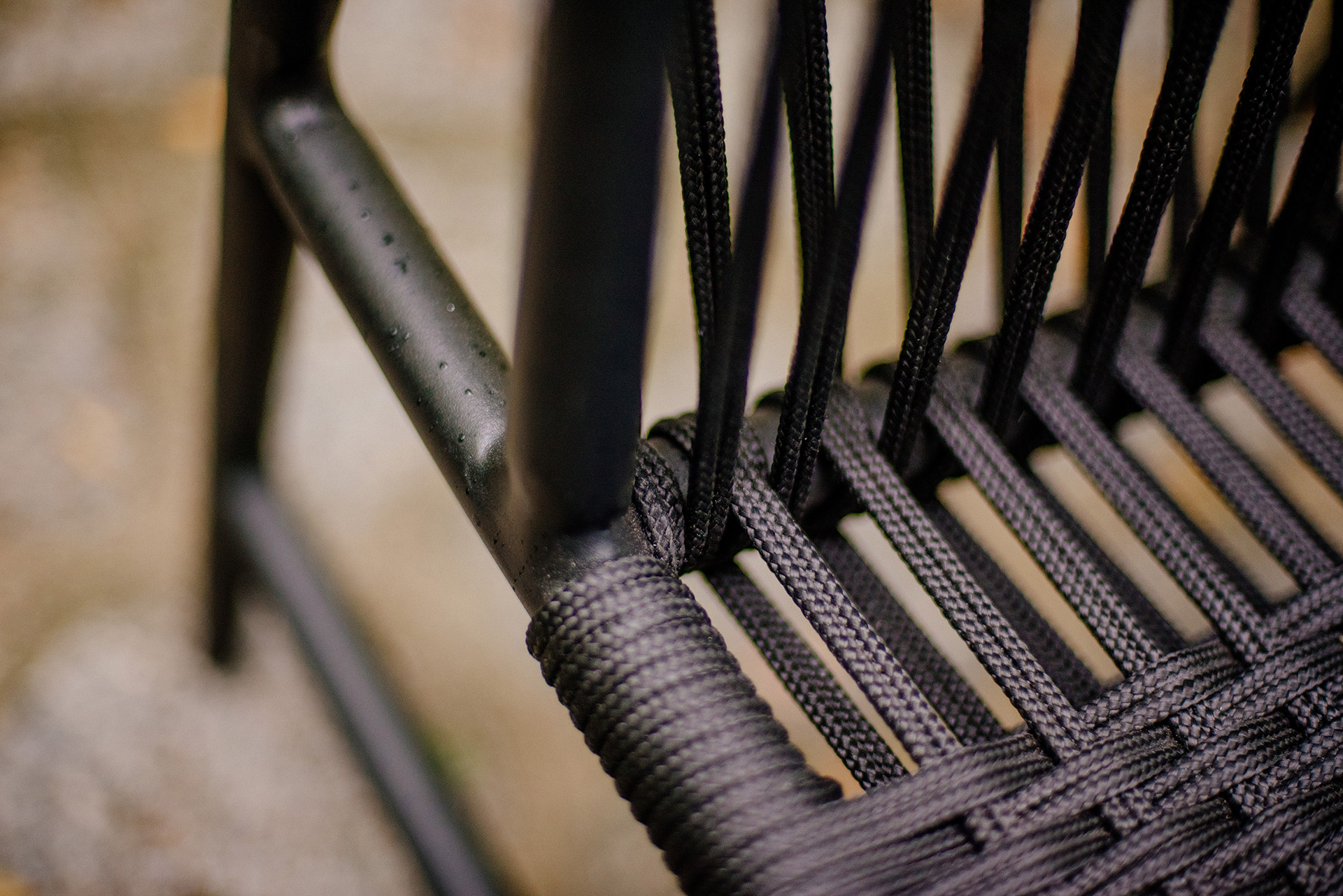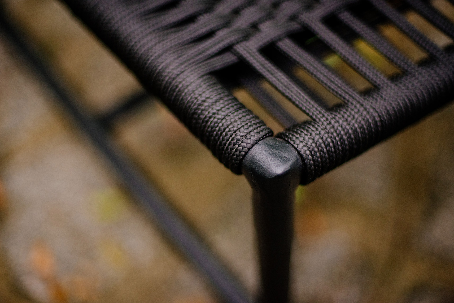 Estrutura em alumínio, pintura eletrostática e revestimento em corda náutica cilíndrica 6mm.