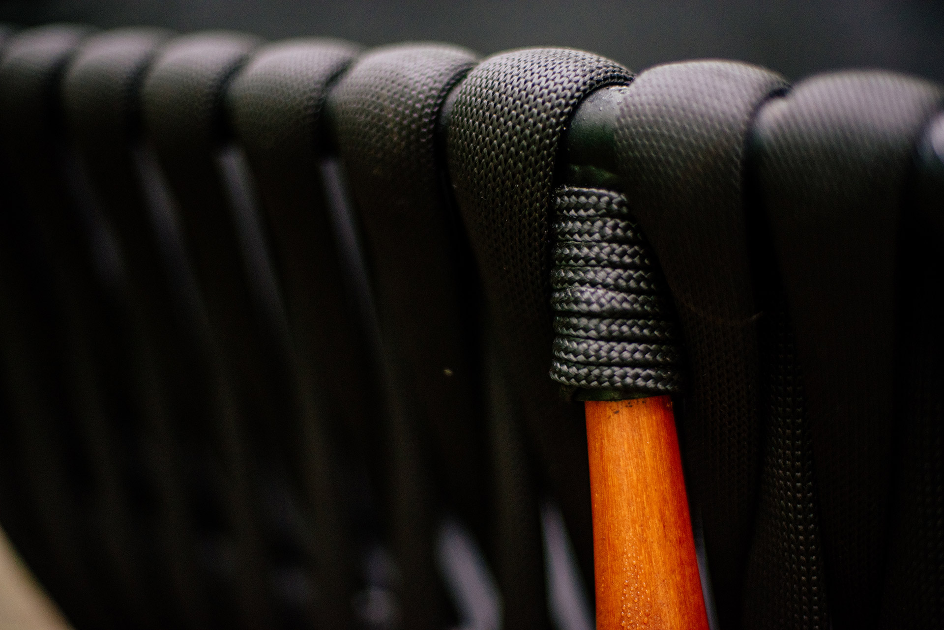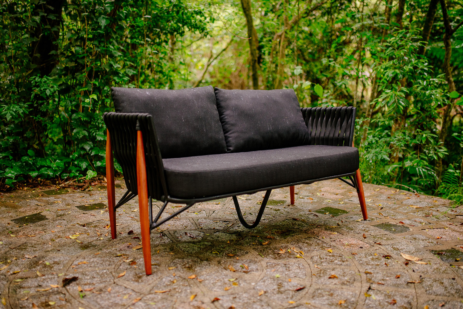 Estrutura em alumínio, pintura eletrostática, revestimento em tricot e pés em madeira.
