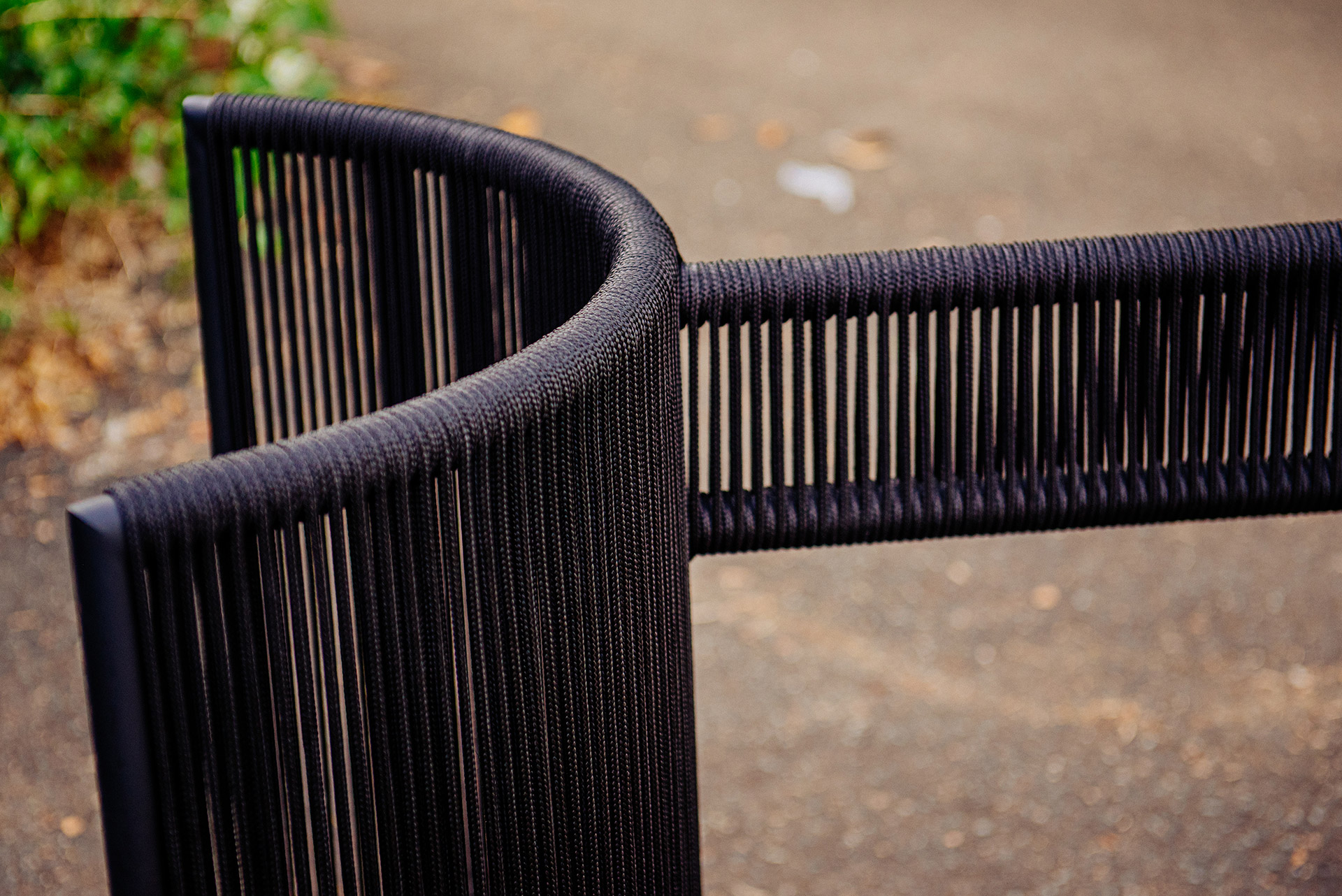 Estrutura em alumínio, pintura eletrostática e revestimento em corda náutica cilíndrica 6mm.