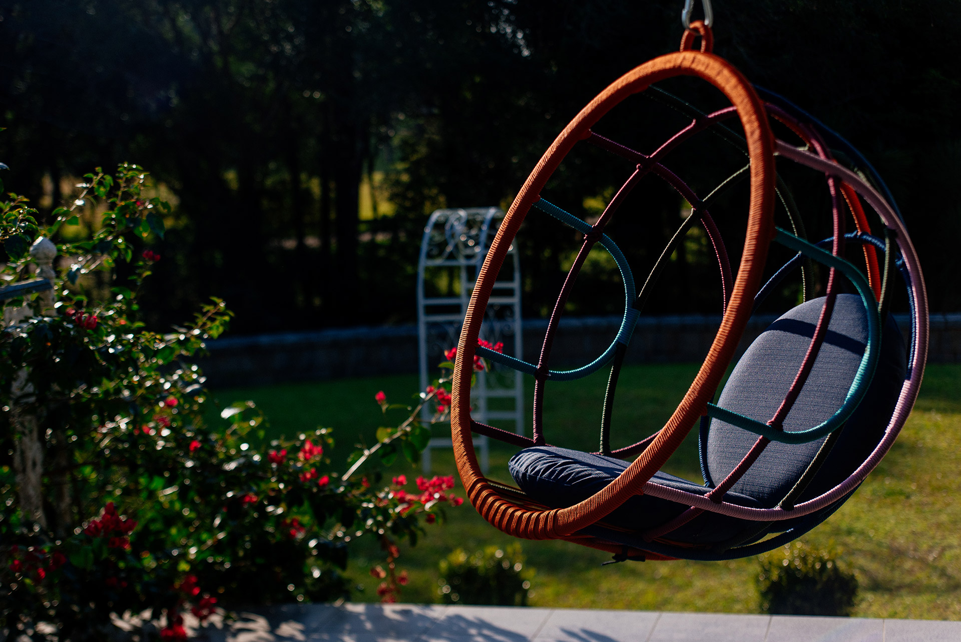 MATERIAL E ACABAMENTO: Estrutura em alumínio, pintura eletrostática e revestimento em corda náutica cilíndrica 6mm. MEDIDAS: Ø 1,13 x 0,73 m bloco 3d: Priora