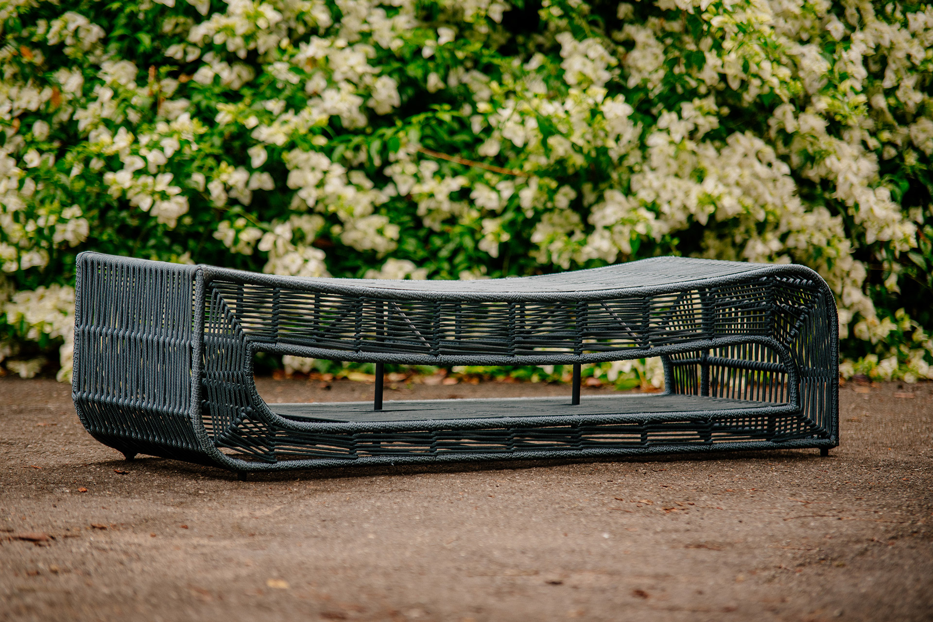 MATERIAL E ACABAMENTO: Estrutura em alumínio, pintura eletrostática e revestimento em corda náutica chata 10mm. MEDIDAS: 1,47 x 0,43 x 0,44 m DESIGN AUTORAL: