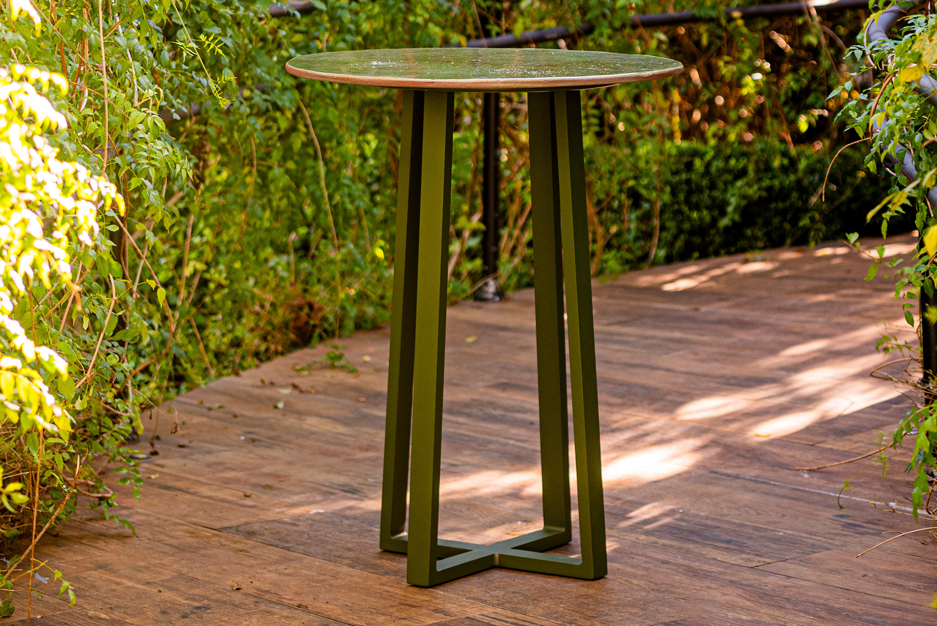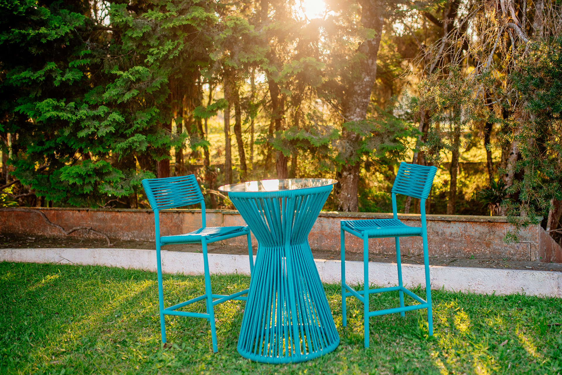 MATERIAL E ACABAMENTO: Estrutura em alumínio, pintura eletrostática e revestimento em corda náutica cilíndrica 10mm e tampo em madeira. MEDIDAS: Ø 0,68 x 1,00