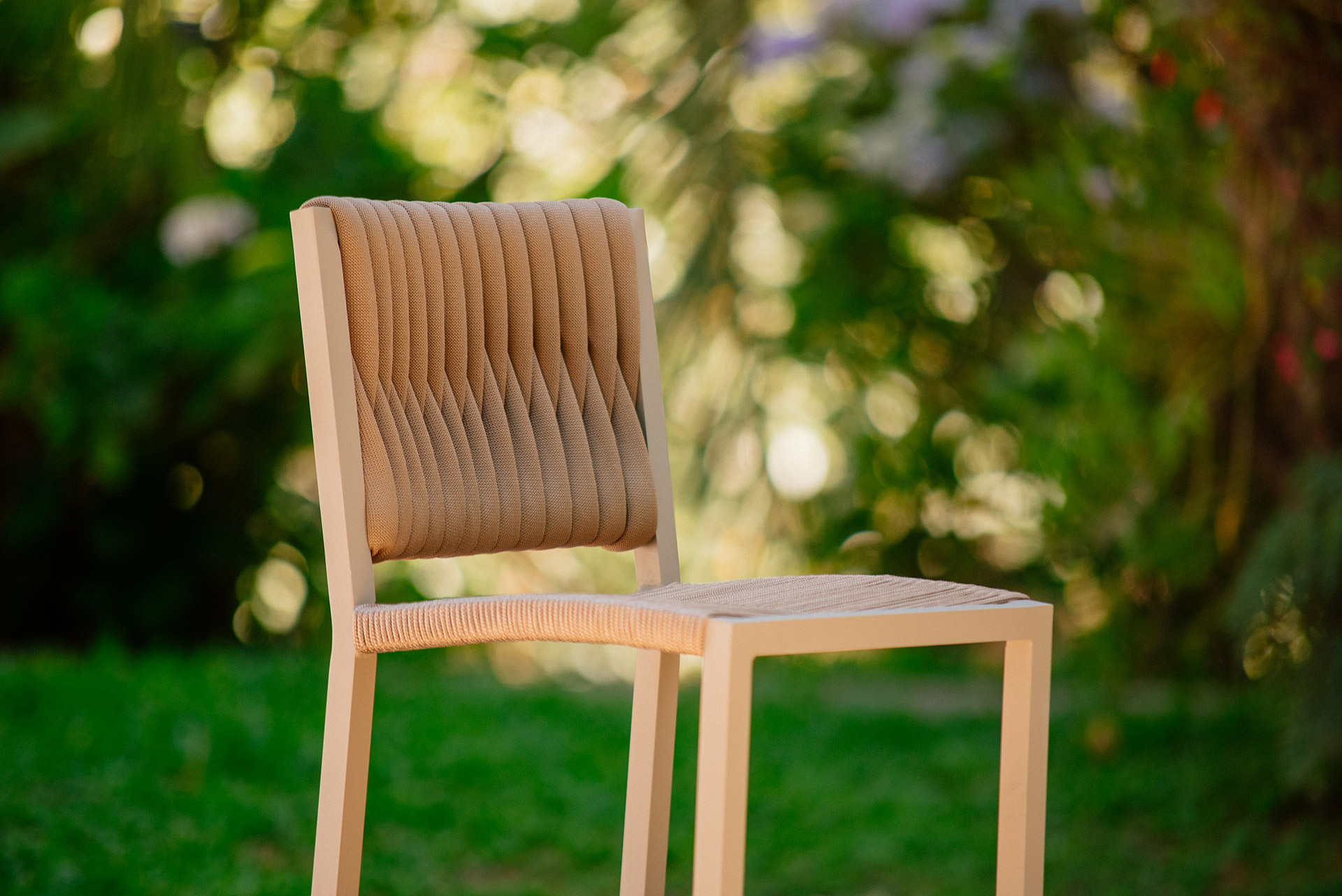 MATERIAL E ACABAMENTO: Estrutura em alumínio, pintura eletrostática e revestimento em corda náutica cilíndrica 6mm e tricot. MEDIDAS: 0,40 x 0,49 x 0,99 m