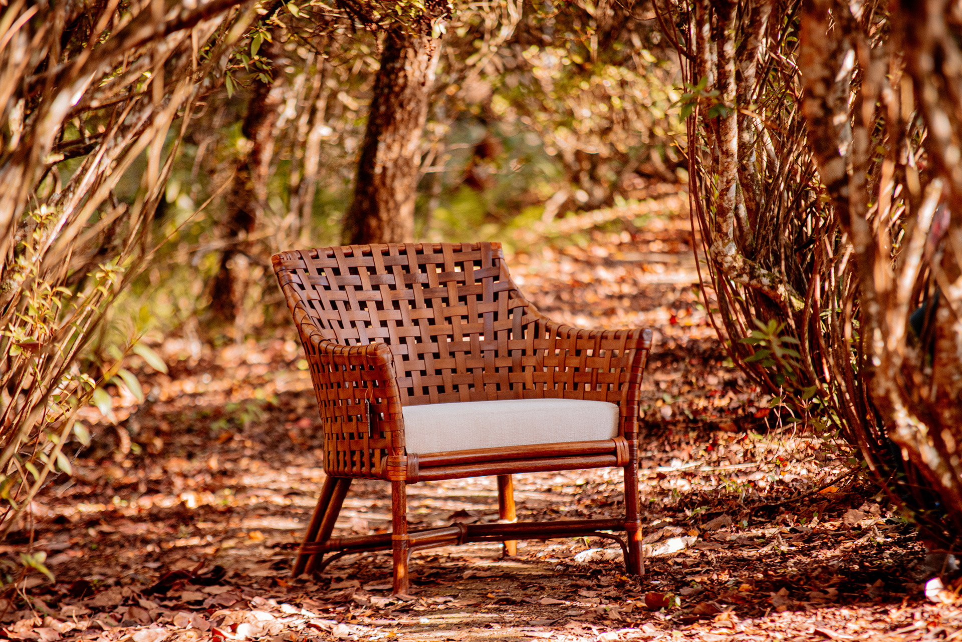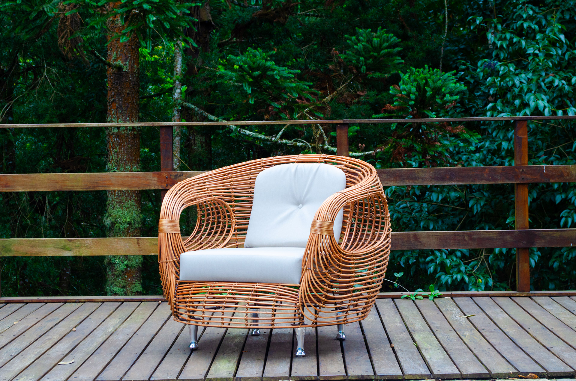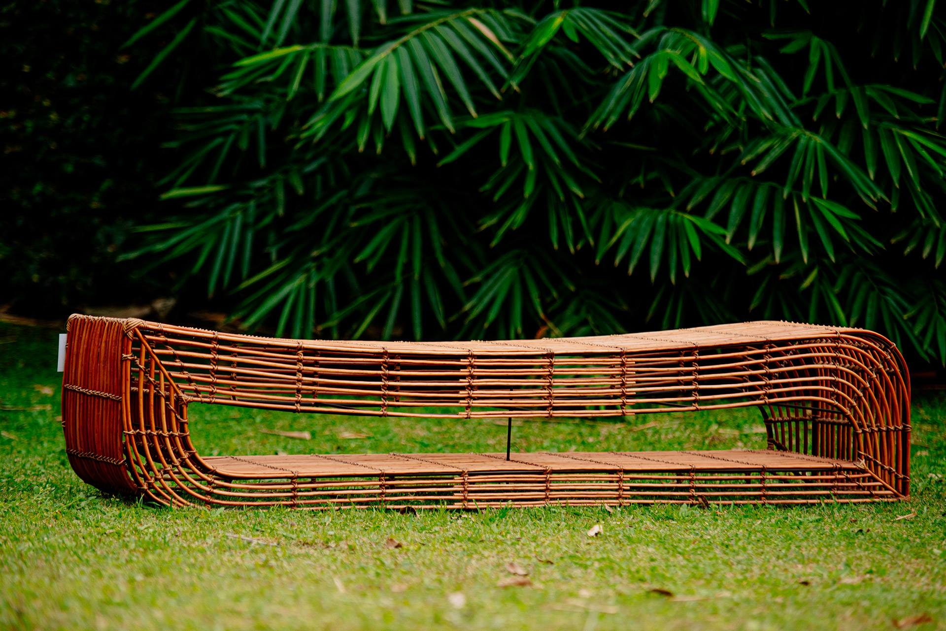 MATERIAL E ACABAMENTO: Estrutura em apuí, revestimento em fibra sintética e amarras em junco. MEDIDAS: 0,72 x 0,70 x 0,78 DESIGN AUTORAL: Guilherme Pella