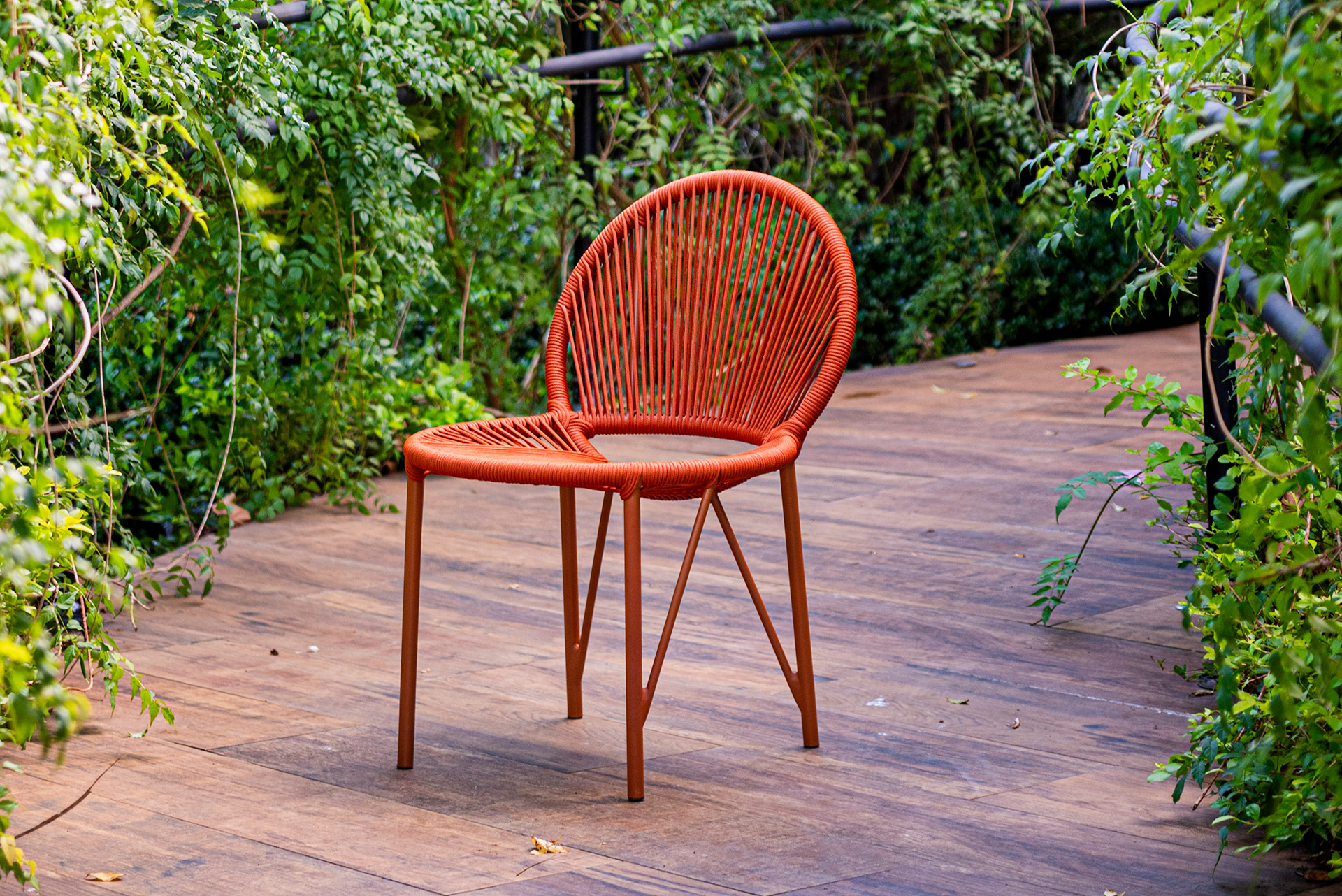 MATERIAL E ACABAMENTO: Estrutura em alumínio, pintura eletrostática e revestimento em corda náutica cilíndrica 6mm e madeira. MEDIDAS: Cadeiras com e sem braço0,60 x