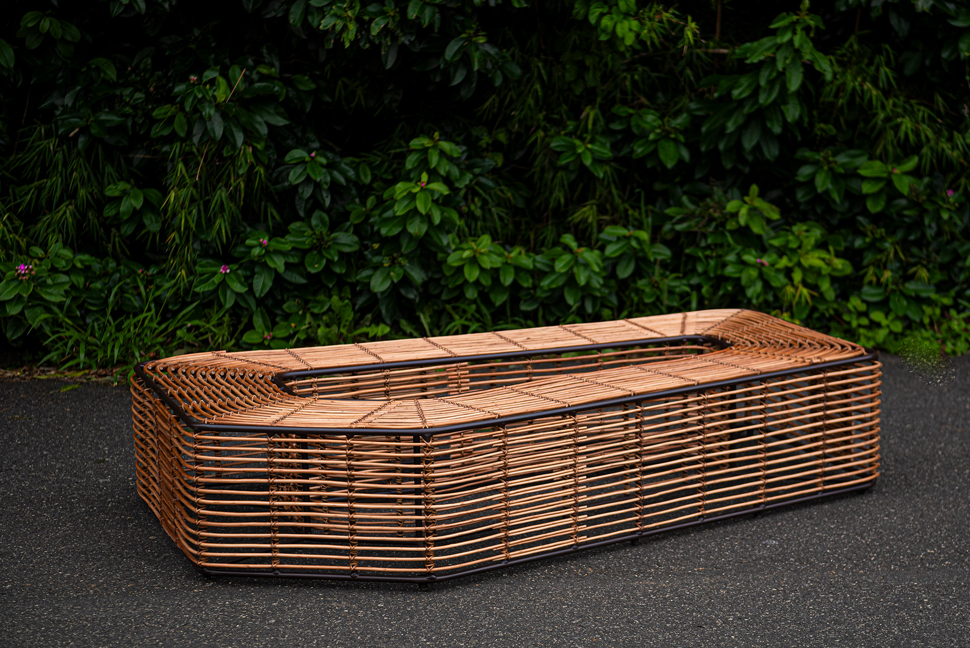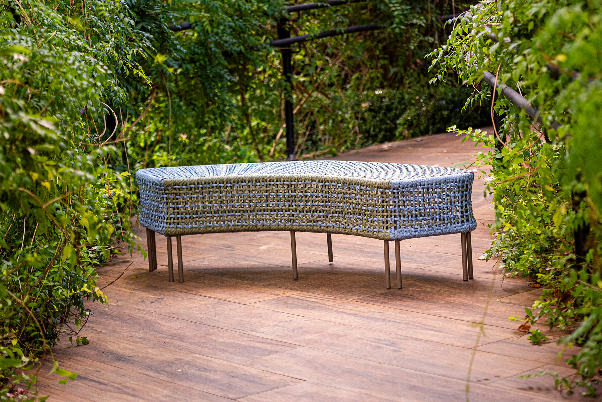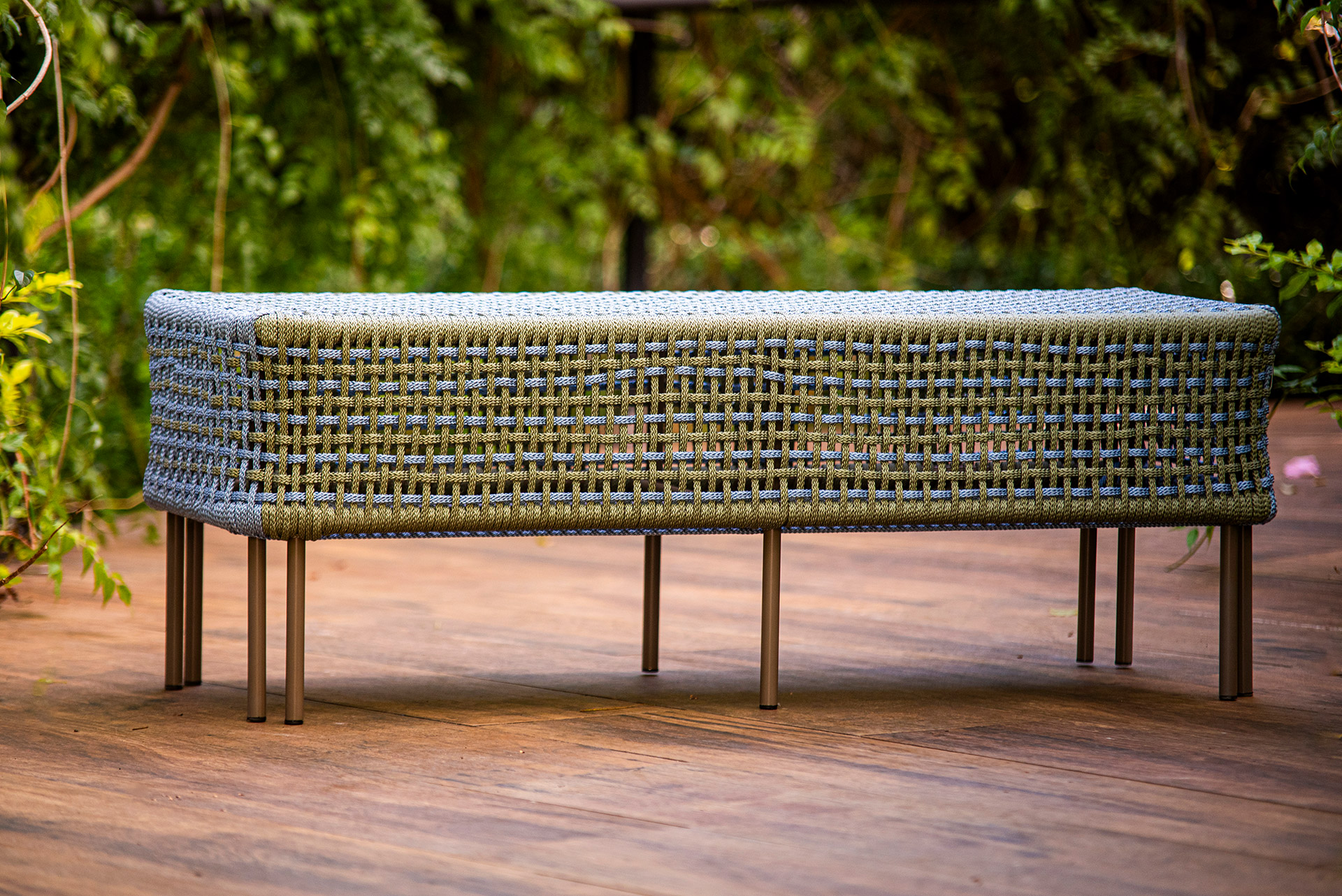 MATERIAL E ACABAMENTO: Estrutura em alumínio, pintura eletrostática e revestimento em corda náutica chata 10mm. MEDIDAS: 1,47 x 0,43 x 0,44 m DESIGN AUTORAL: