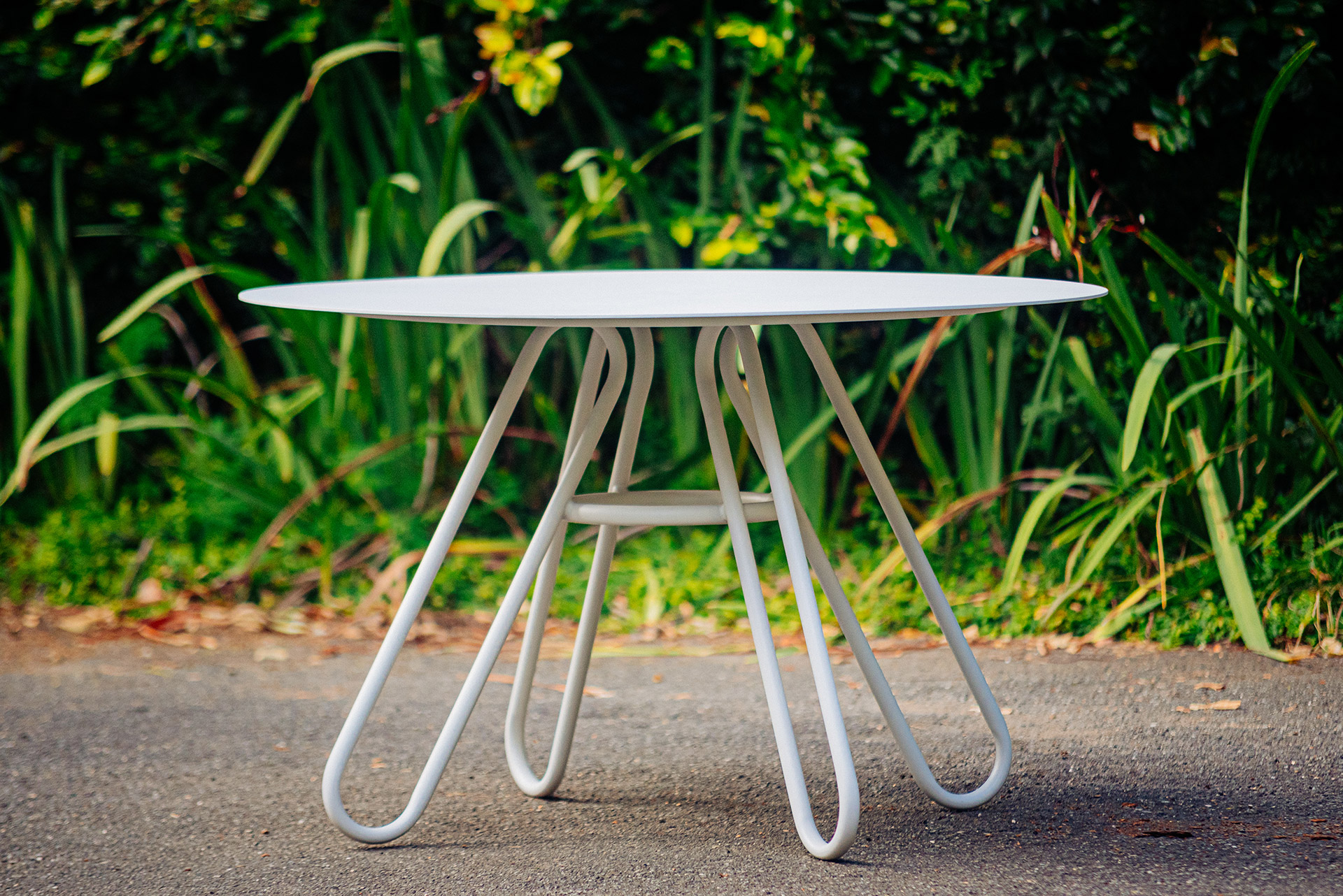 MATERIAL E ACABAMENTO: Estrutura em alumínio com pintura eletrostática, tampo em madeira ripada, alumínio liso ou alumínio ripado. MEDIDAS: 0,90 x 0,90 x 0,76