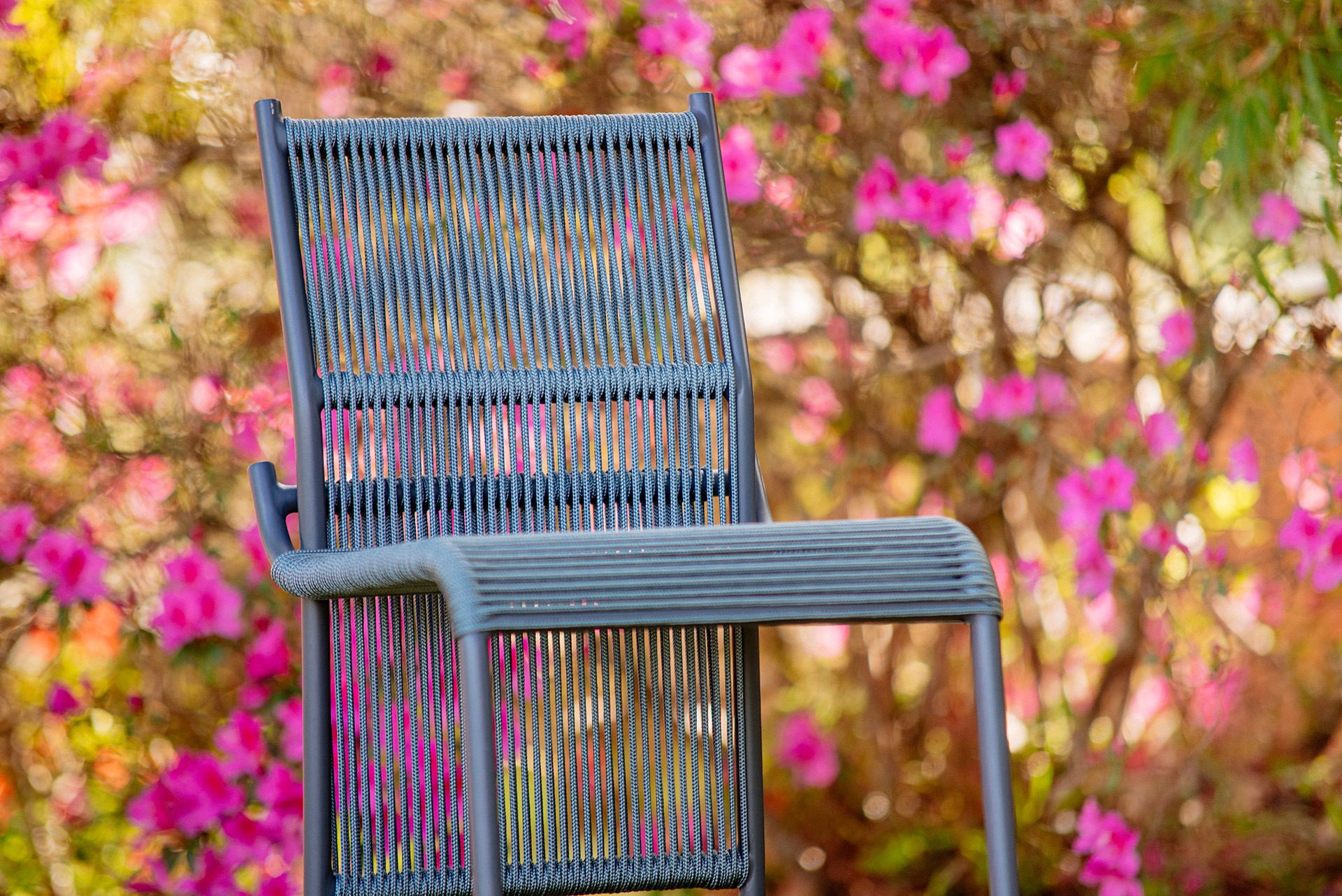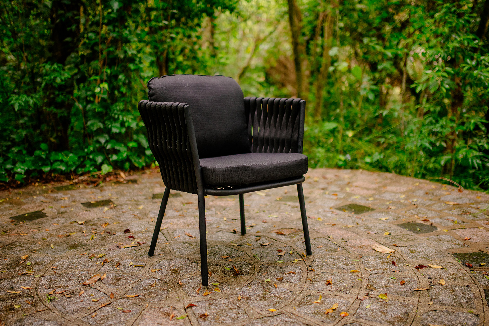 MATERIAL E ACABAMENTO: Estrutura em alumínio, pintura eletrostática e revestimento em corda náutica cilíndrica 6mm. MEDIDAS: Cadeira com e sembraço: 0,60 x 0,70 x