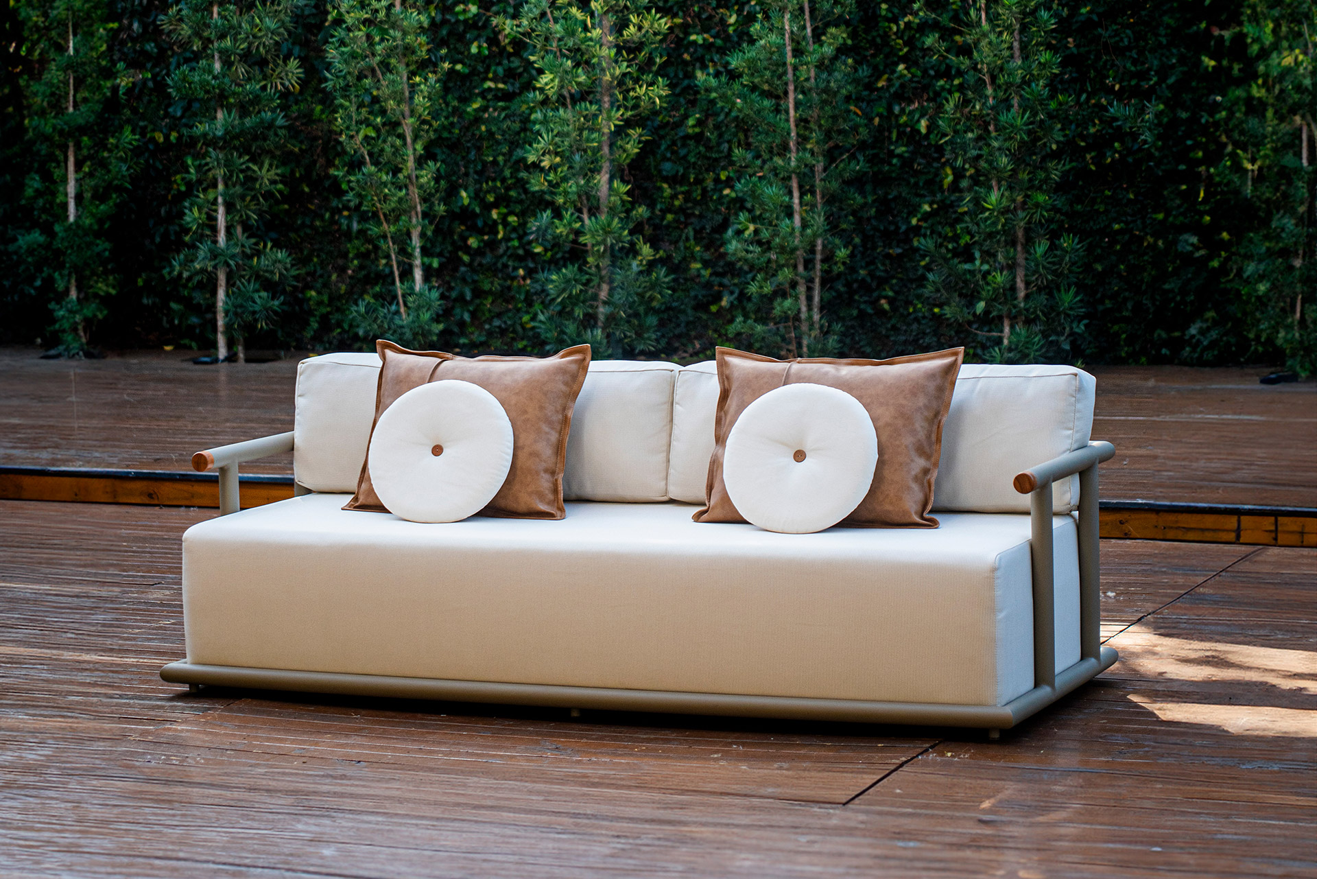 MATERIAL E ACABAMENTO: Estrutura em alumínio, pintura eletrostática e revestimento em fibra sintética. MEDIDAS: 0,80 x 0,90 x 0,87 m DESIGN AUTORAL: Aline Mazarotto