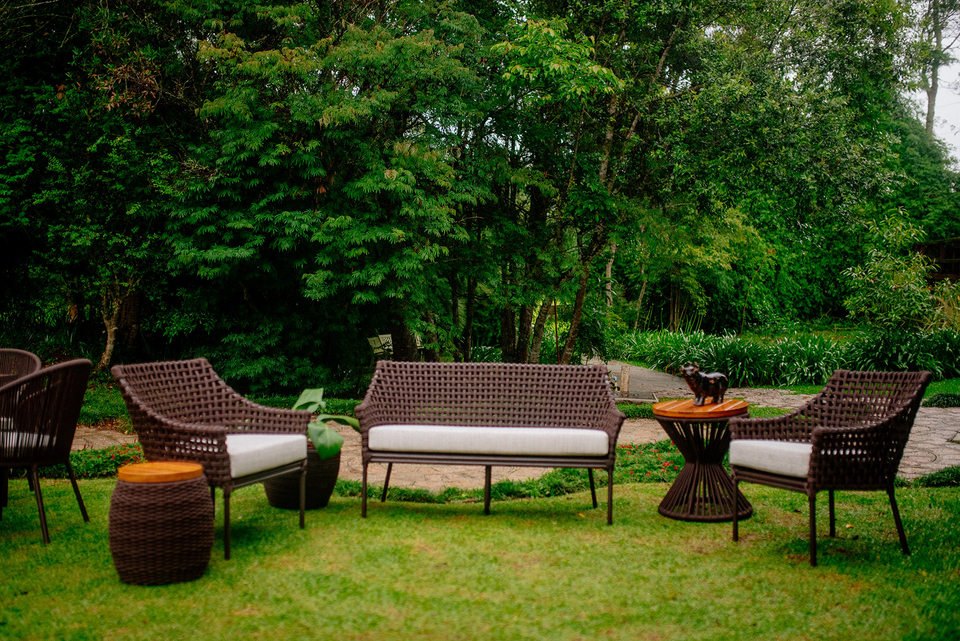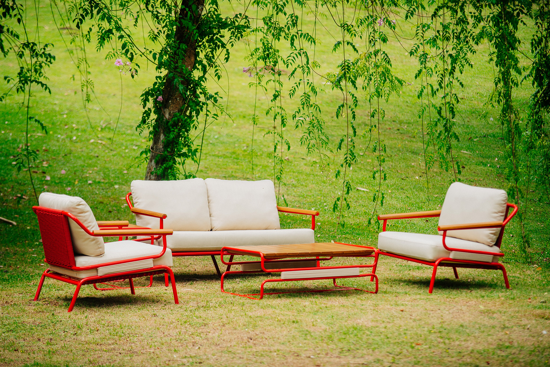 MATERIAL E ACABAMENTO: Estrutura em alumínio, pintura eletrostática e braços com detalhe em madeira. MEDIDAS: Poltrona0,90 x 0,90 x 0,73 m Sofás1,80 x 0,90