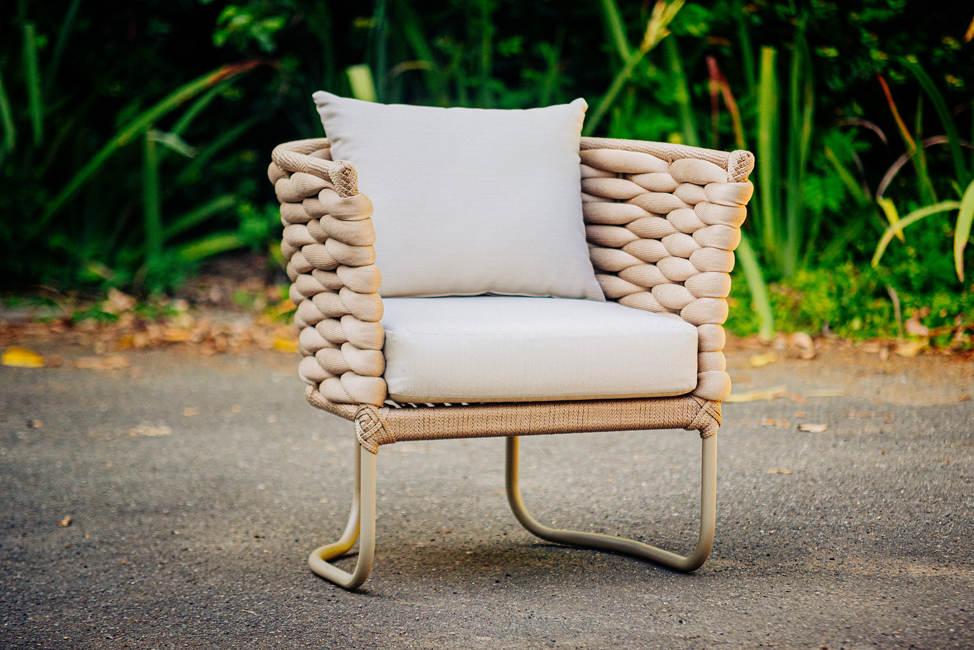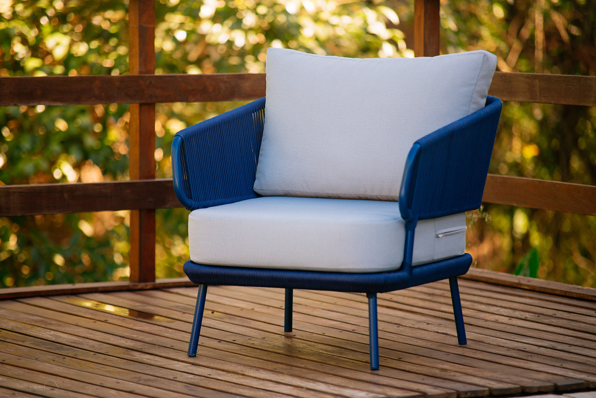 MATERIAL E ACABAMENTO: Estrutura em alumínio, pintura eletrostática e revestimento em corda náutica chata 22mm. MEDIDAS: Poltrona 0,78 x 0,75 x 0,82 m Sofá