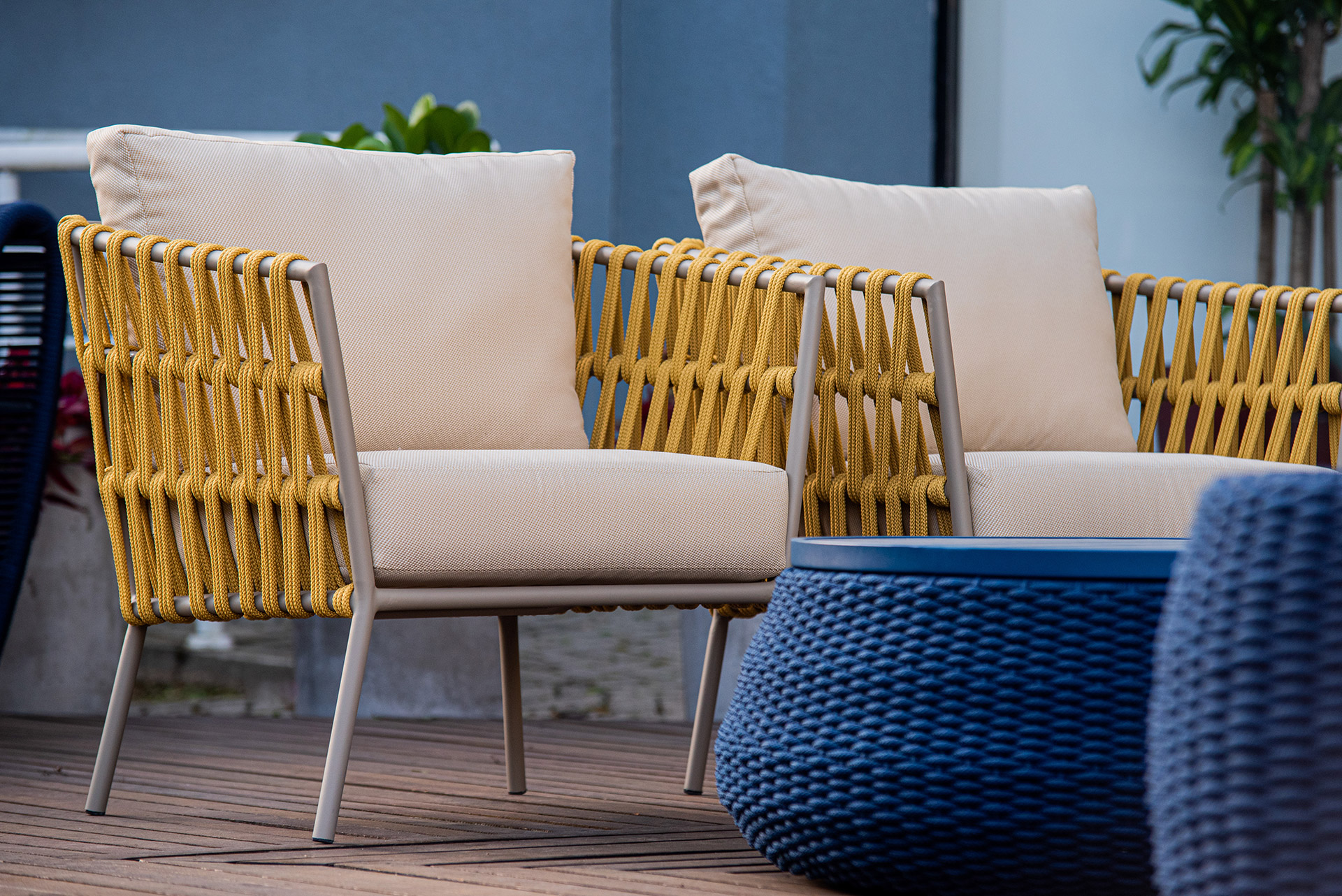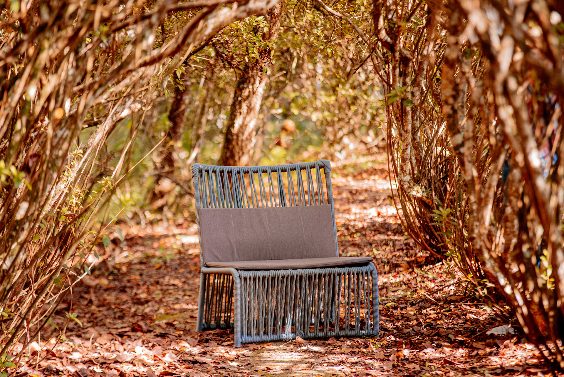 MATERIAL E ACABAMENTO: Estrutura em alumínio, pintura eletrostática e revestimento em corda náutica cilíndrica 6mm. MEDIDAS: Poltrona 0,85 x 0,77 x 0,78 m Sofás